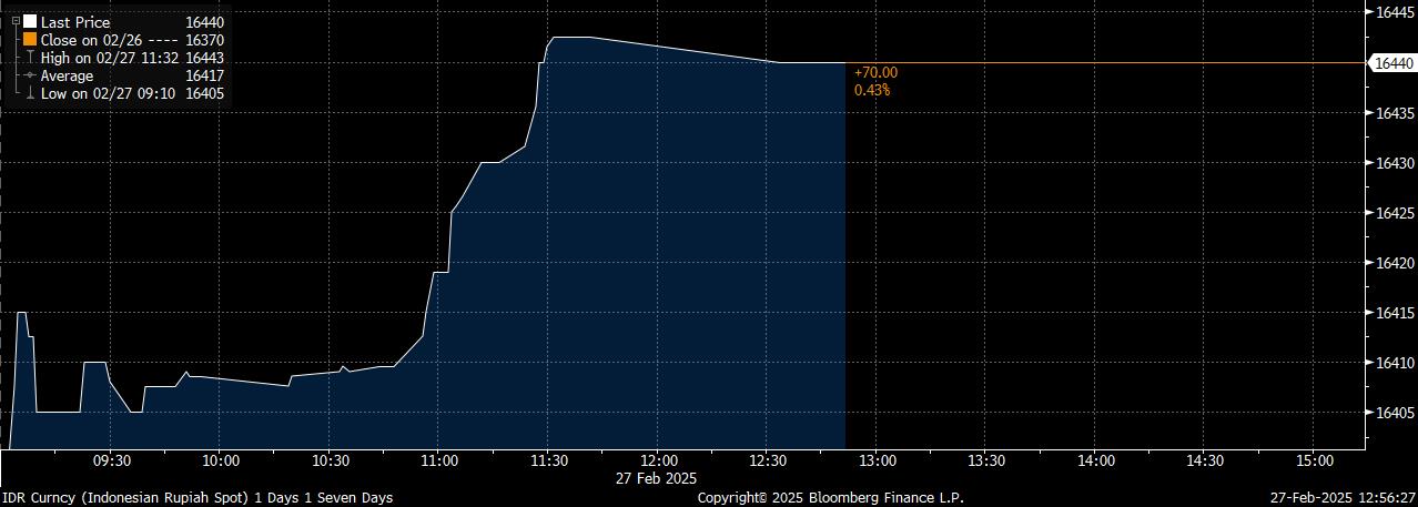 Sejak pagi tadi, nilai tukar rupiah terhadap dolar AS dibuka langsung drop dalam pembukaan perdagangan pasar spot, Kamis (27/2/2025) melampaui level Rp16.415/US$.