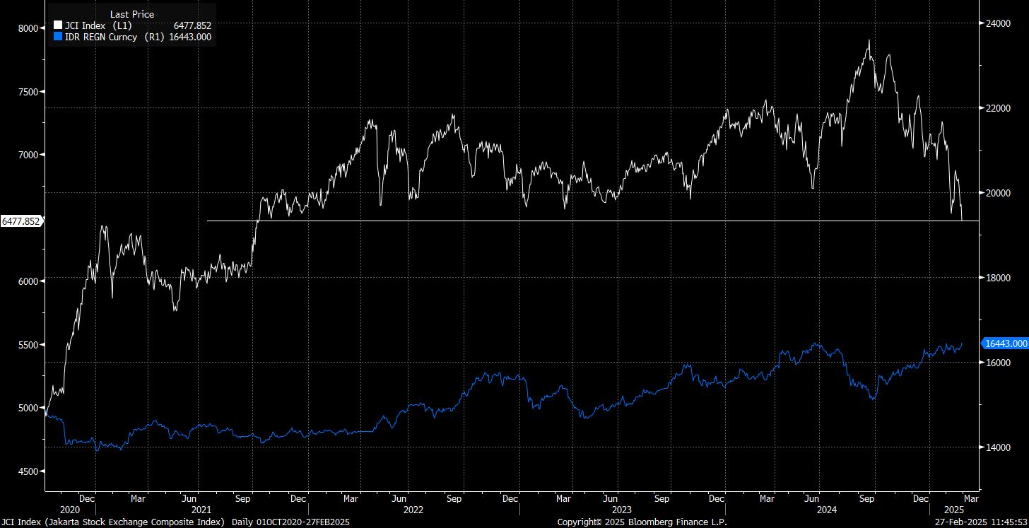 "Kami memprediksi kebijakan tarif AS sebesar 10% pada China akan berdampak langsung menurunkan 0,2 poin persentase laju PDB Indonesia pada 2025. Itu terutama karena ekspor yang melemah dan arus investasi tetap yang juga turun. Hal itu berarti, pertumbuhan ekonomi Indonesia bisa melambat di kisaran 4,9% tahun ini, di bawah target Pemerintah RI sebesar 5,2%. Sementara, rencana Presiden Prabowo memangkas anggaran, bisa menjadi penghambat [pertumbuhan] tambahan," kata Lloyd Chan, Ahli Strategi di MUFG Bank, salah satu bank terbesar di Jepang, dilansir dari Bloomberg.