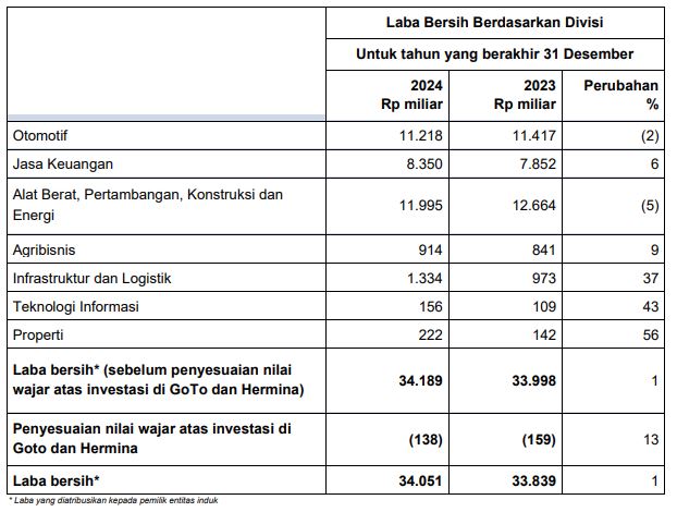 Kedua adalah divisi otomotif, dengan sumbangan laba bersih Rp 11,22 triliun. Minus 1,74% dibandingkan 2023.
