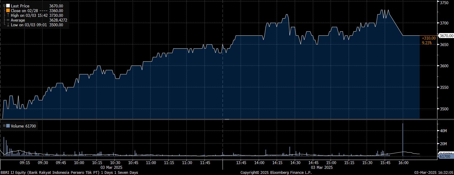 Senada, tren positif juga terjadi pada saham LQ45 berikut, saham PT Bank Mandiri Tbk (BMRI) mencatat kenaikan 6,52% ke posisi Rp4.900/saham, saham PT Bank Syariah Indonesia Tbk (BRIS) menguat 6,41% ke posisi Rp2.660/saham. Saham PT Bank Negara Indonesia Tbk (BBNI) melesat 5,71% ke posisi Rp4.260/saham.