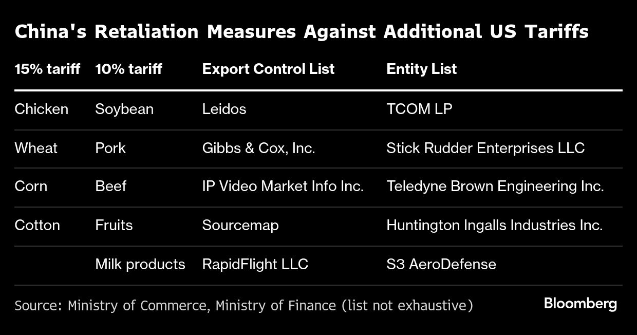 Selain tarif, Kementerian Perdagangan China juga memasukkan 10 perusahaan Amerika—yang sebagian besar bergerak di sektor pertahanan—ke dalam daftar entitas yang "tidak dapat diandalkan". Sebanyak 15 perusahaan lainnya, termasuk General Dynamics Land Systems dan Skydio Inc, juga masuk dalam daftar kontrol ekspor.