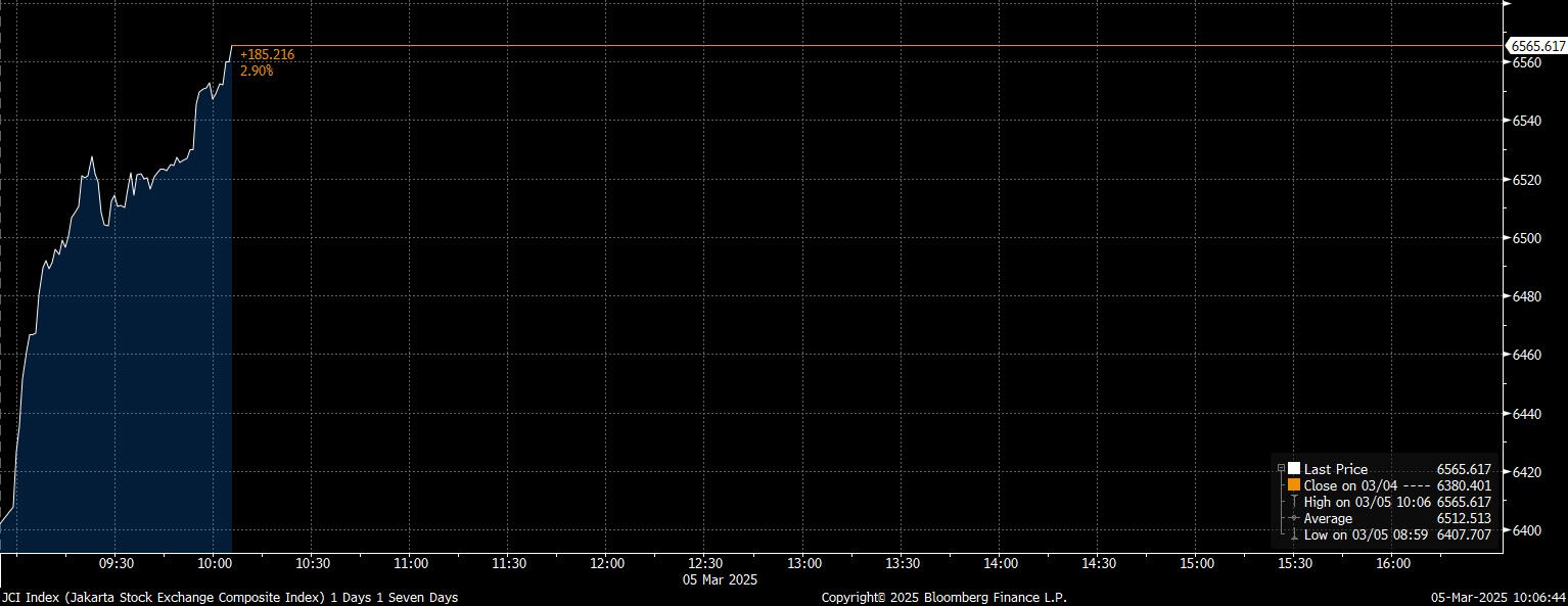 Dengan pencapaian positif itu, IHSG mencatat kenaikan tertinggi nomor satu di Asia, juga peringkat pertama di ASEAN berdasarkan data Bloomberg, Rabu (5/3/2025) pagi hari.