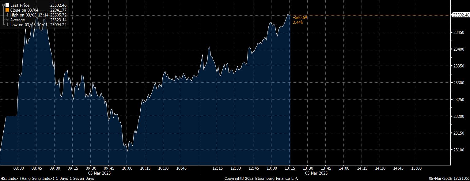 Adapun Bursa Saham Hong Kong, dan saham-saham China memimpin kenaikan tersengat sentimen target pertumbuhan Ekonomi yang memicu spekulasi akan ada lebih banyak stimulus.