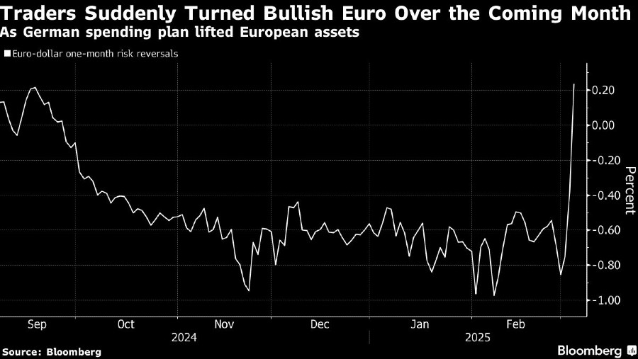 Imbal hasil obligasi Jerman 10 tahun melonjak 30 basis poin, tertinggi sejak 1990, setelah calon kanselir, Friedrich Merz, menguraikan perombakan fiskal besar-besaran pada Selasa malam. Euro menguat ke level yang belum pernah terlihat sejak November.