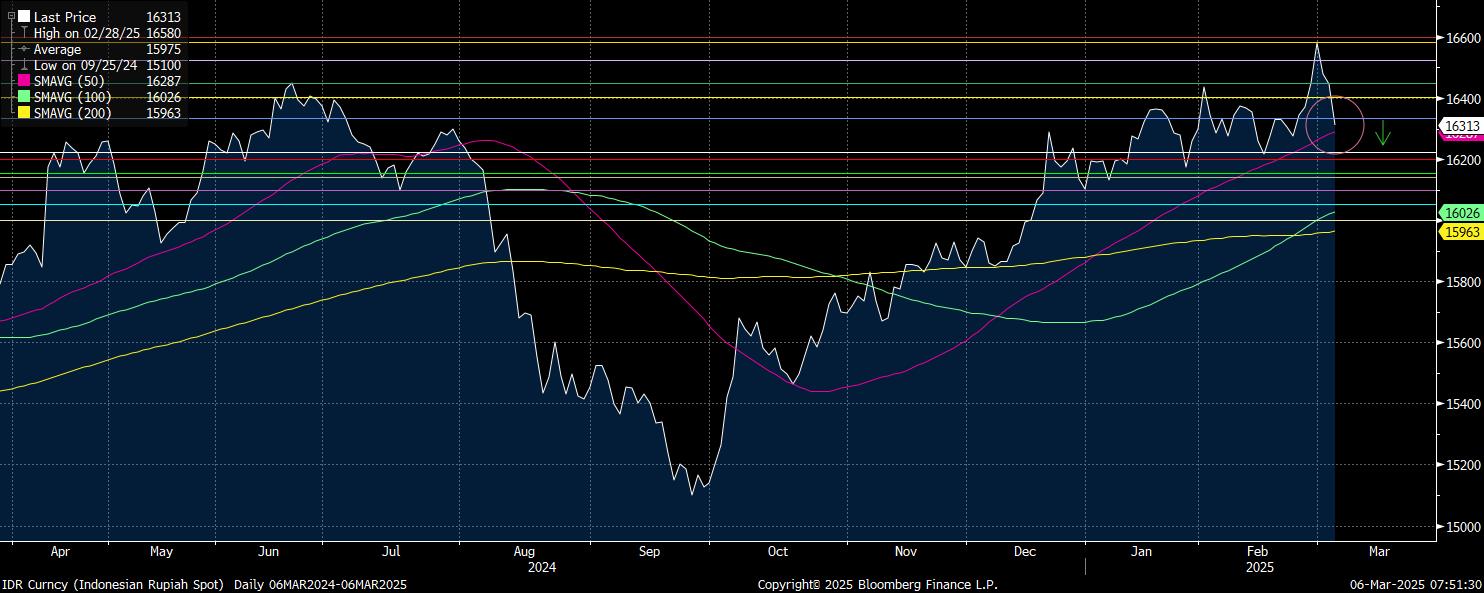 Sementara trendline sebelumnya pada time frame daily menjadi support psikologis potensial pada level Rp16.350/US$. Target pelemahan lanjutan untuk kembali ke level Rp16.400/US$.