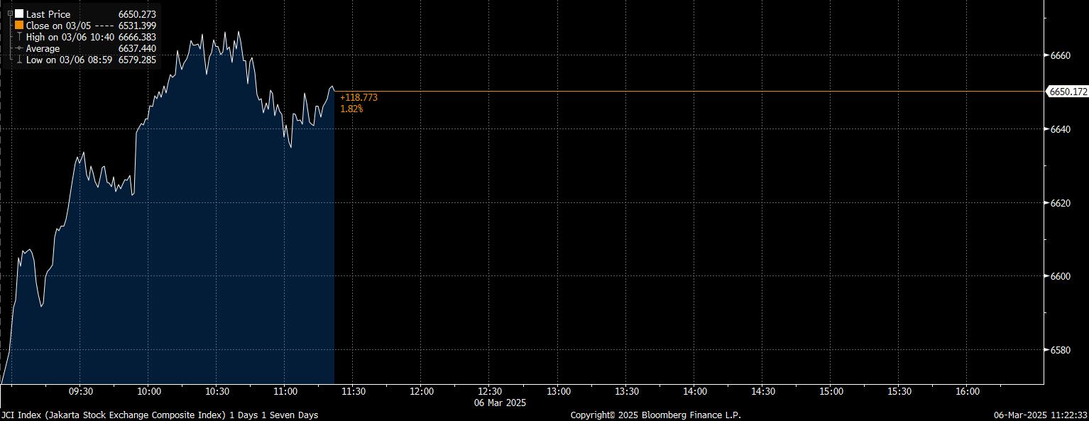 Bloomberg Technoz, Jakarta - Indeks Harga Saham Gabungan (IHSG) pada Sesi I perdagangan pagi Kamis (6/3/2025) mencetak angka kenaikan yang makin tinggi. IHSG menguat 1,82% ke posisi 6.650,17. IHSG bahkan berhasil menyentuh level tertinggi 6.667,89 pada pukul 10.40 WIB.