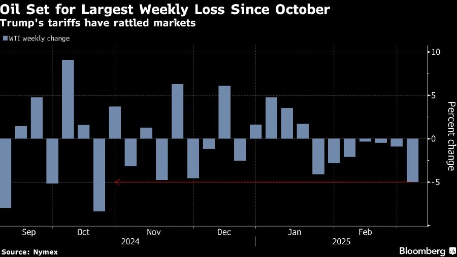 Kebijakan perdagangan Trump dan pembalasan dari negara-negara yang menjadi sasaran, termasuk China, telah mengguncang pasar, di mana harga minyak mentah AS menuju penurunan mingguan ketujuh, penurunan terpanjang sejak Desember 2023.