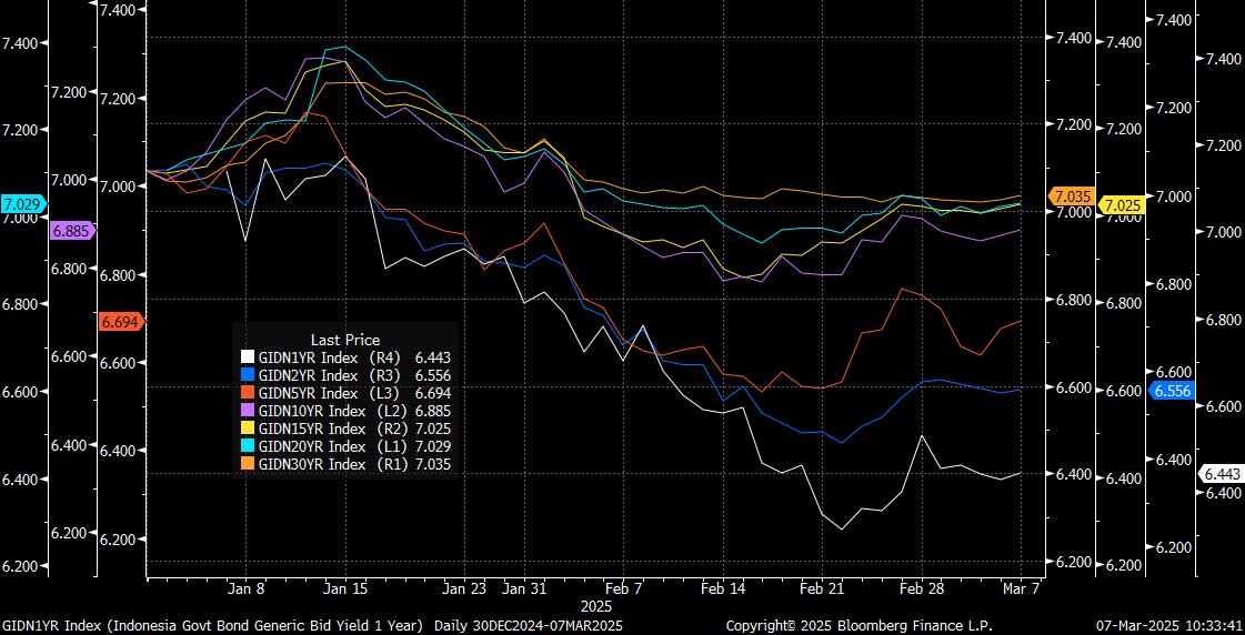 Hal itu terindikasi dari kenaikan imbal hasil di hampir semua tenor SBN. Mengacu data OTC Bloomberg realtime, yield 1Y naik 1,5 basis poin ke level 6,443%. Tenor 2Y bergerak sedikit naik ke 6,556%.