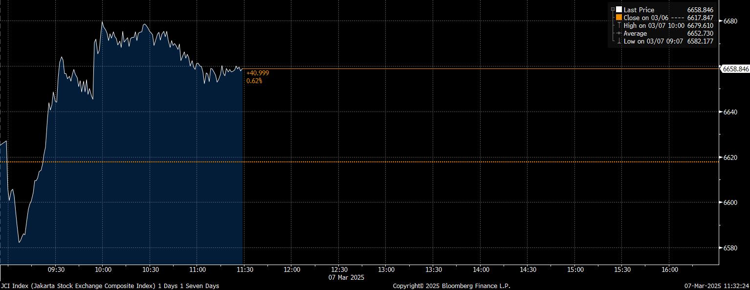 Bloomberg Technoz, Jakarta - Indeks Harga Saham Gabungan (IHSG) pada Sesi I melaju di zona hijau dengan kenaikan 40,99 poin, atau menguat 0,62% pada posisi 6.658,84 pada perdagangan Jumat (7/3/2025).