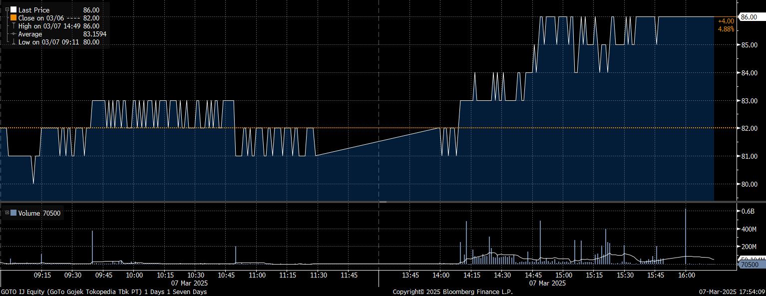 Selain itu, penguatan juga terjadi pada saham PT GoTo Gojek Tokopedia Tbk (GOTO) melesat 4,88%, saham PT Solusi Sinergi Digital Tbk (WIFI) yang melesat 4,48%, saham PT Digital Mediatama Maxima Tbk (DMMX) yang melejit 3,54%, dan juga dengan saham PT WIR Asia Tbk (WIRG) yang menguat 1,75%.