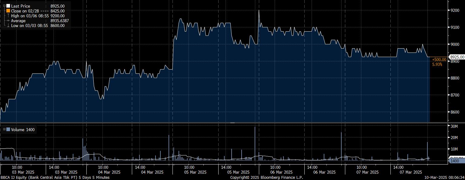 Pada kesempatan yang sama, investor asing tercatat net buy saham terbanyak pada PT Bank Central Asia Tbk (BBCA) mencapai Rp525,52 miliar. Bersamaan dengan aksi pembelian, saham BBCA menguat 5,93% dalam sepekan ke posisi Rp8.925/saham.