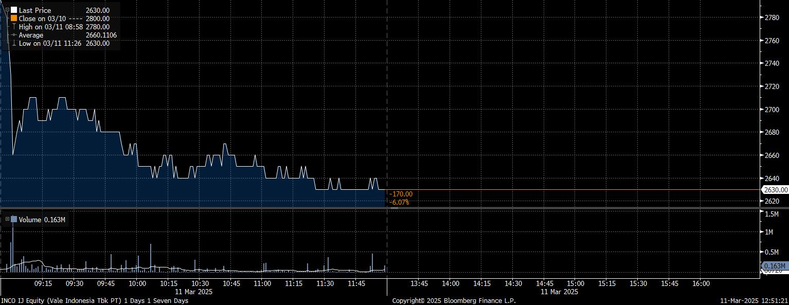 Yang jadi perhatian investor, saham PT Merdeka Battery Materials Tbk (MBMA) drop 6,08% ke posisi Rp278/saham. Untuk saham PT Vale Indonesia Tbk (INCO) juga jatuh 6,07% menjadi Rp2.630/saham. Senada, saham PT Merdeka Copper Gold Tbk (MDKA) melemah 5,71% ke Rp1.320/saham.