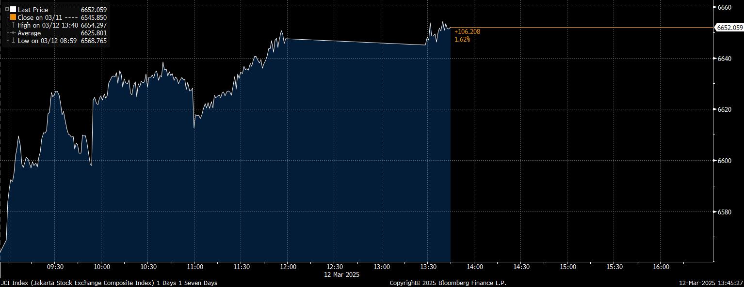 Pada Rabu (12/3/2025), IHSG tengah melaju di posisi 6.652,05 pada perdagangan siang hari, menguat 106,2 poin dan apresiasi 1,62% dibandingkan dengan perdagangan sebelumnya.
