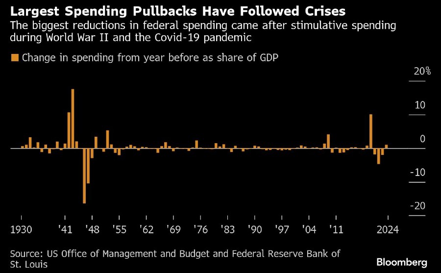 Pengurangan belanja sebesar yang diusulkan Musk juga hanya memiliki sedikit preseden dalam sejarah AS modern. Satu-satunya kemunduran yang lebih besar ialah setelah Perang Dunia II dan pada tahun 2022, ketika ada kemunduran dari belanja stimulus pandemi yang diawasi Trump dan Joe Biden pada tahun 2020 dan 2021.