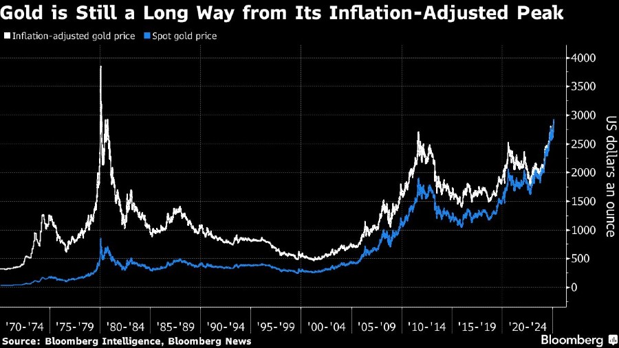 Terlepas dari relinya, emas masih jauh dari puncaknya yang disesuaikan dengan inflasi sepanjang masa, yang ditetapkan pada 1980 dan setara dengan sekitar US$3.800 per ons. Saat itu, kombinasi dari pertumbuhan ekonomi yang lemah, inflasi yang tinggi, dan friksi geopolitik yang meningkat membuat harga melambung tinggi. Beberapa analis percaya kekuatan serupa akan membawa emas bergerak lebih jauh pada tahun 2025.
