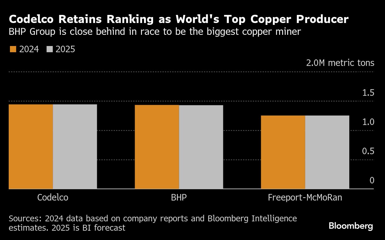 Codelco mencatat total produksi sepanjang tahun sebesar 1,44 juta metrik ton tahun lalu, termasuk bagiannya dari tambang yang tidak dioperasikannya. Angka itu dibandingkan dengan produksi yang dapat diatribusikan kepada BHP sebesar 1,43 juta ton, menurut estimasi Bloomberg Intelligence.