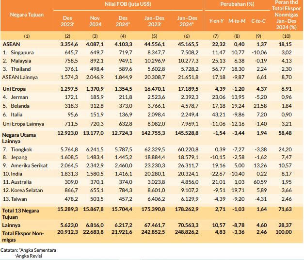 Mengutip catatan Badan Pusat Statistik, AS adalah salah satu negara tujuan ekspor utama Indonesia. Sepanjang 2024, nilai ekspor non-migas Indonesia ke AS adalah US$26,31 miliar, naik 13,26% dibandingkan 2023.