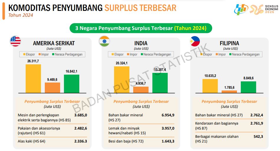 Surplus ini menjadi yang terbesar dari seluruh negara yang berdagang dengan Indonesia. Setelah AS, ada India dan Filipina.