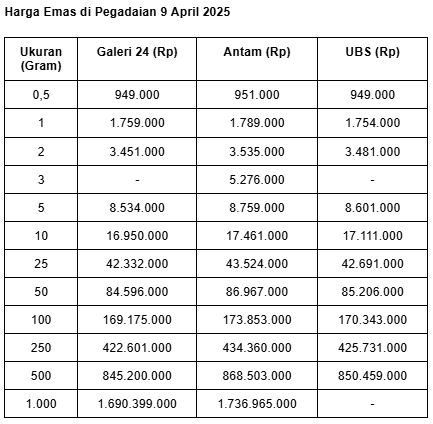 Lalu untuk emas batangan Galeri 24 ukuran 0,5 gram, Pegadaian menjual di harga Rp 949.000. Terpangkas Rp 7.000 dibandingkan kemarin.