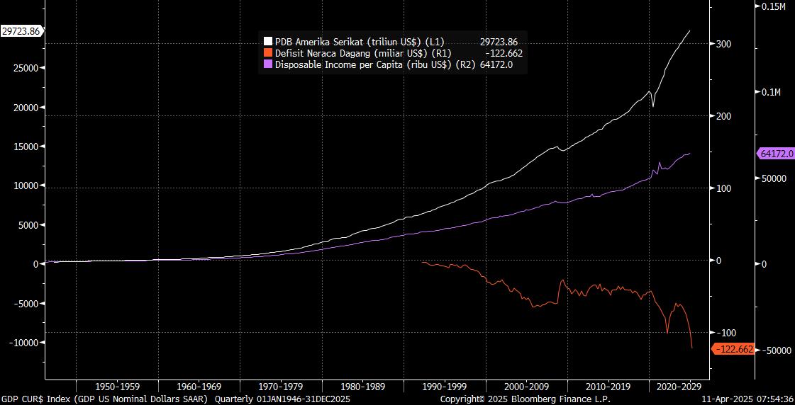 Sebagai gambaran, nilai PDB Amerika sampai Desember 2024, mencapai US$ 29,72 triliun, terbesar di dunia. Belanja konsumen alias konsumsi jadi penyokong utama ekonomi AS, selain investasi, belanja pemerintah serta ekspor.