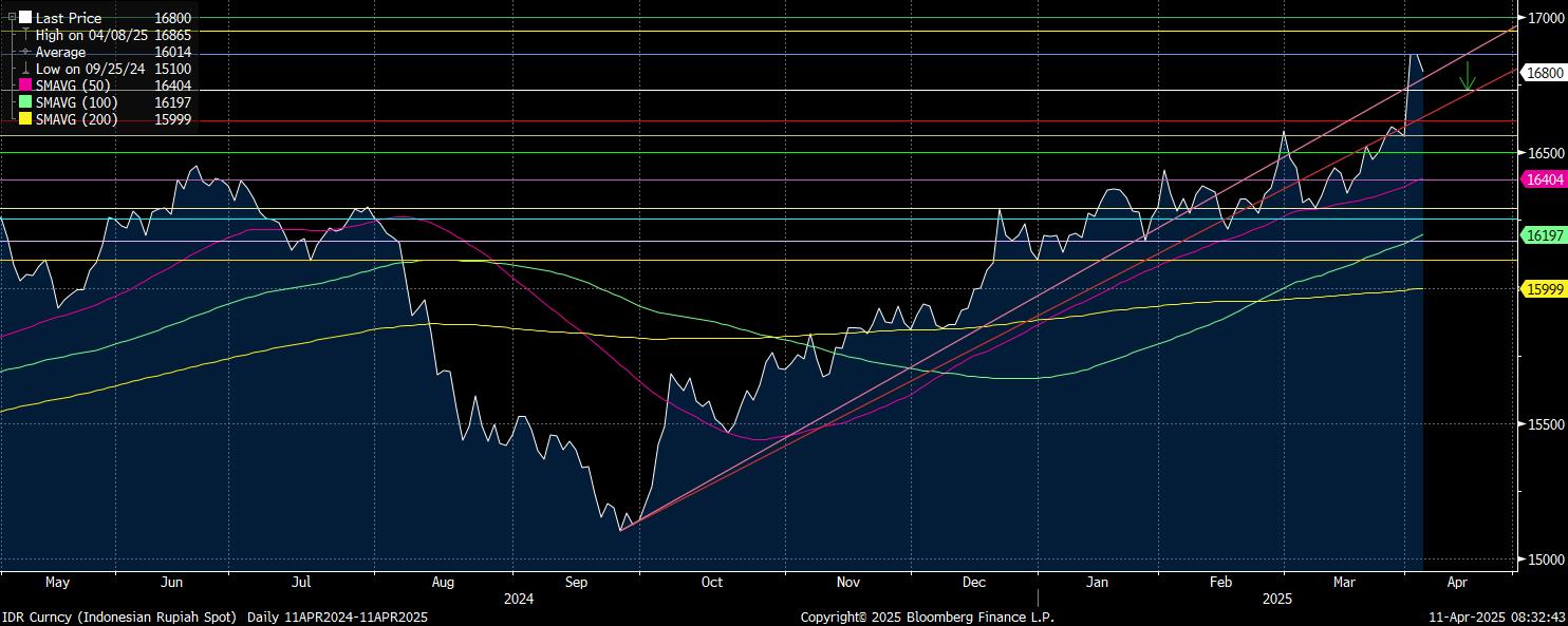 Sementara trendline sebelumnya pada time frame daily, kini menjadi support psikologis potensial pada level Rp16.900/US$. Kemudian, target pelemahan lanjutan untuk kembali ke level Rp17.000/US$.