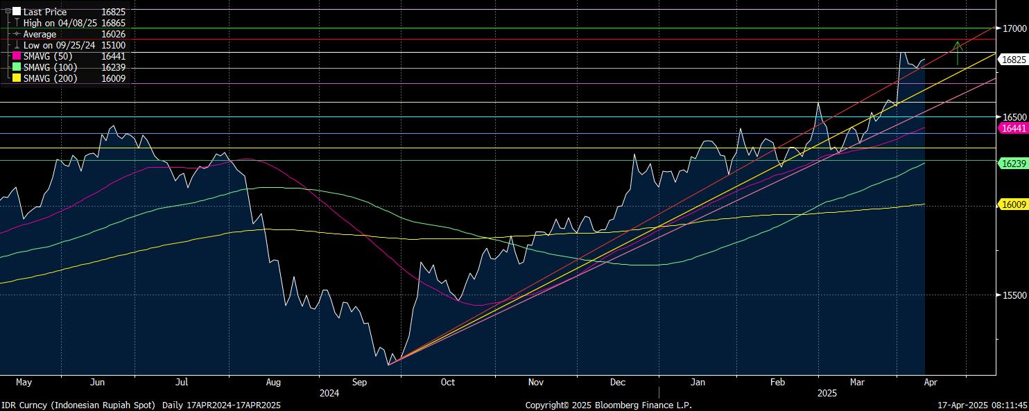 Secara teknikal, rupiah memiliki level resistance terdekat di Rp16.800/US$. Bila penguatan berlanjut, rupiah bisa menuju Rp16.770/US$.