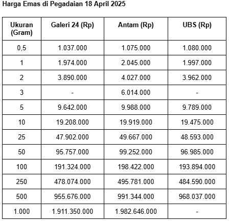 Sedangkan untuk ukuran 1 gram, harga emas Galeri 24 di Pegadaian adalah Rp 1.974.000. Rp 50.000 dari posisi hari sebelumnya.