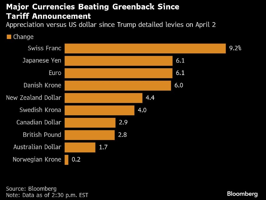 Bloomberg Dollar Spot Index turun 0,7% pada Senin. Setiap mata uang dari negara anggota G-10 menguat terhadap dolar AS. Lonjakan yen membebani indeks saham di Jepang, mendorong Nikkei 225 jatuh 1,3%.
