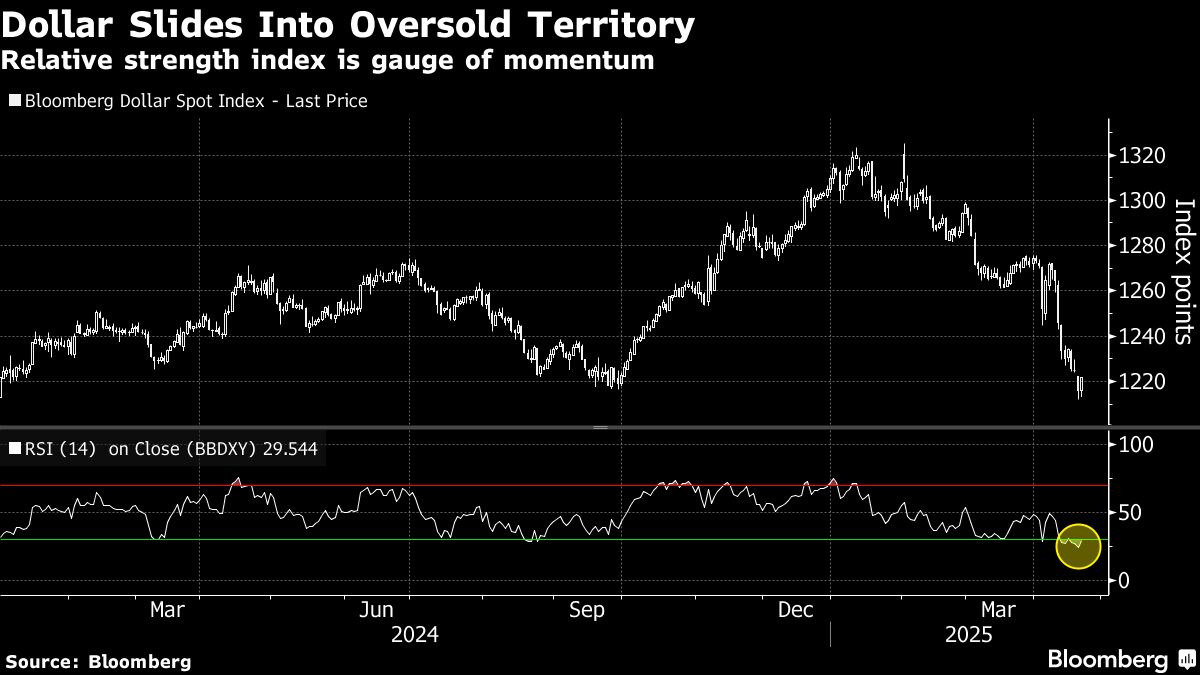 Beberapa indikator teknikal dan posisi pasar menunjukkan adanya kelebihan dalam taruhan bearish terhadap dolar. Mata uang AS jatuh ke level terendah sejak Desember 2023 minggu ini setelah ancaman Trump untuk memecat Powell dan risiko resesi AS memicu perdagangan “sell America“.