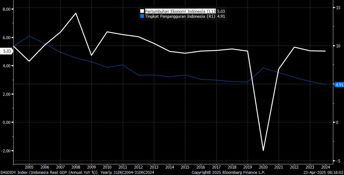 Pada saat yang sama, Tingkat Pengangguran Terbuka (TPT) pada kelompok usia muda melonjak hingga di angka 17,32% pada 2024 lalu. Angka itu mencerminkan, dalam 100 orang penduduk Indonesia berusia 15-24 tahun yang termasuk angkatan kerja, terdapat 17 orang yang menganggur.
