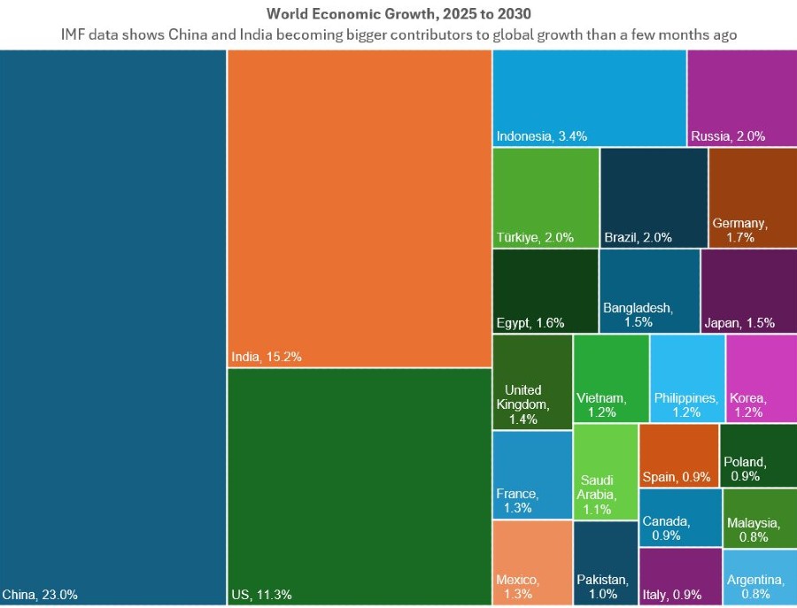 Menurut proyeksi yang diterbitkan pekan ini berdasarkan paritas daya beli, dibandingkan dengan perkiraan yang dibuat pada Oktober, IMF kini memperkirakan pertumbuhan lebih besar akan datang dari China dan India. Sementara itu, kontribusi yang diharapkan dari AS direvisi turun.
