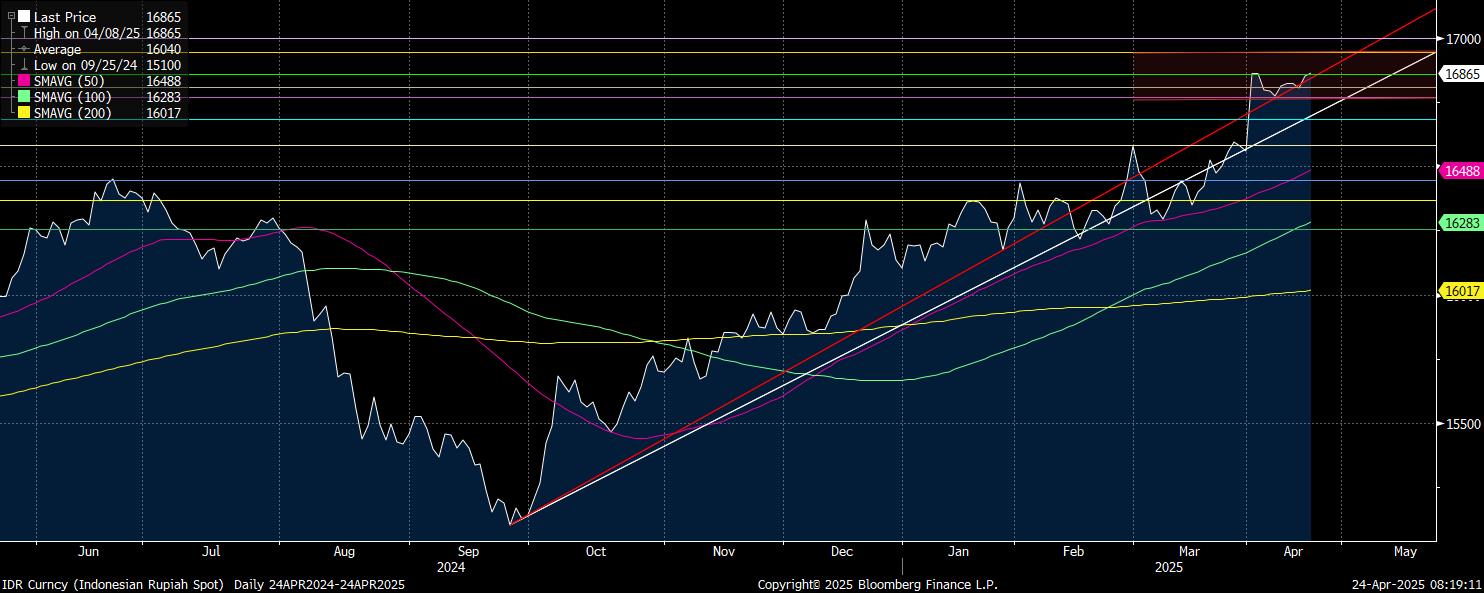 Sementara trendline sebelumnya pada time frame daily menjadi resistance terdekat potensial pada level Rp16.850/US$. Kemudian, target penguatan lanjutan untuk kembali ke level Rp16.800/US$.