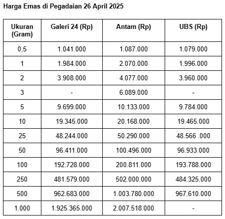 Lalu untuk emas batangan Galeri 24 ukuran 0,5 gram, Pegadaian menjual di harga Rp 1.041.000. Terangkat Rp 9.000 dibandingkan kemarin.