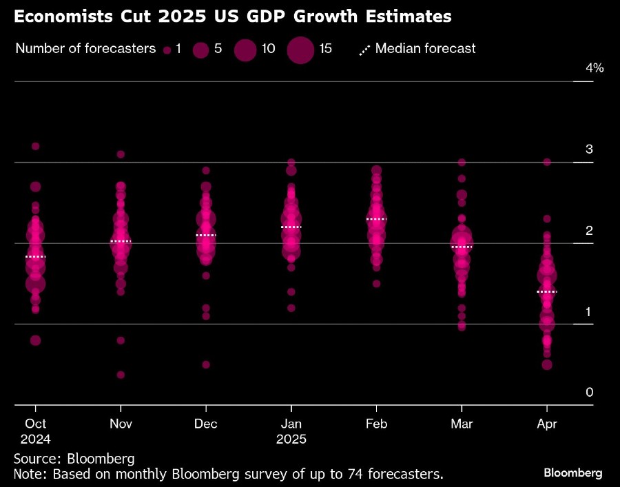 Meski pemerintahan Trump sudah memberlakukan jeda 90 hari untuk beberapa tarif bersifat hukuman yang diumumkan awal bulan ini, tingkat tarif efektif negara itu sekarang hampir mencapai 23%—tertinggi dalam lebih dari satu abad—menurut Bloomberg Economics. Ini berdampak buruk pada sentimen konsumen dan bisnis.