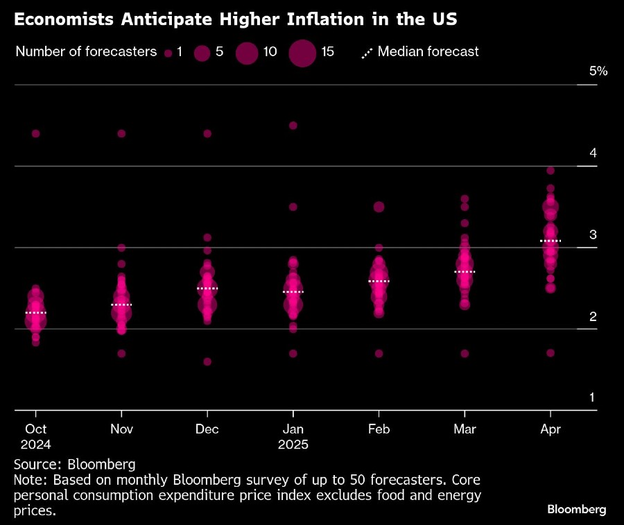 Para ekonom meramal metrik inflasi pilihan Federal Reserve (The Fed)—indeks harga pengeluaran konsumsi pribadi—mencapai puncaknya 3,2% pada akhir 2025, naik dari perkiraan 2,7% dalam survei Maret. Tingkat inflasi inti PCE, yang tidak termasuk makanan dan energi, diperkirakan akan mencapai 3,3%.