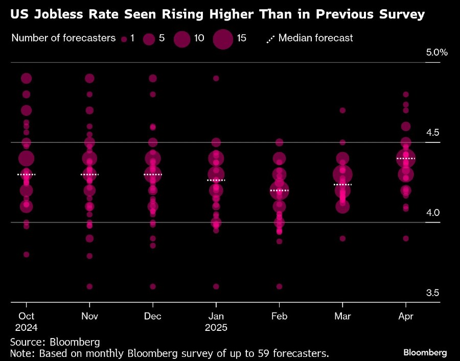 Pasar tenaga kerja sebagian besar tampak bertahan dalam jangka pendek, di mana para ekonom memperkirakan perusahaan akan menambah 72.000 dan 100.000 gaji per bulan secara rata-rata tahun ini dan tahun depan. Mereka memprediksi tingkat pengangguran naik menjadi 4,6% pada akhir tahun 2025, lebih tinggi dari 4,3% proyeksi Maret.