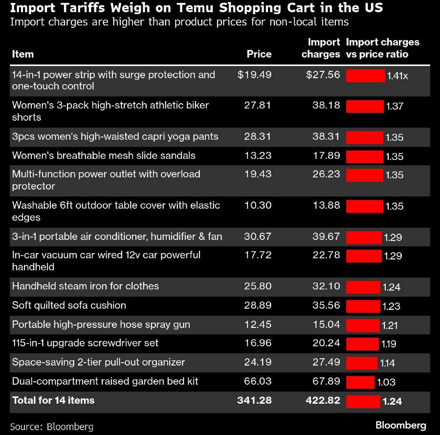 Dalam penelusuran atas 14 barang yang dikirim dari China dalam daftar barang terlaris Temu menunjukkan bahwa pajak yang dibebankan melebihi nilai produk.