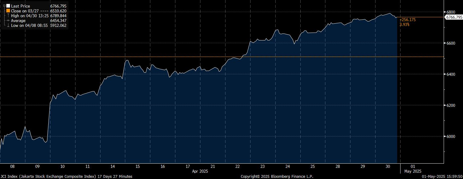 Berdasarkan data Bloomberg, Indeks Harga Saham Gabungan (IHSG) melaju semringah, dengan kenaikan 3,93% di sepanjang perdagangan saham 1–30 April 2025 dan ditutup di 6.766,8.