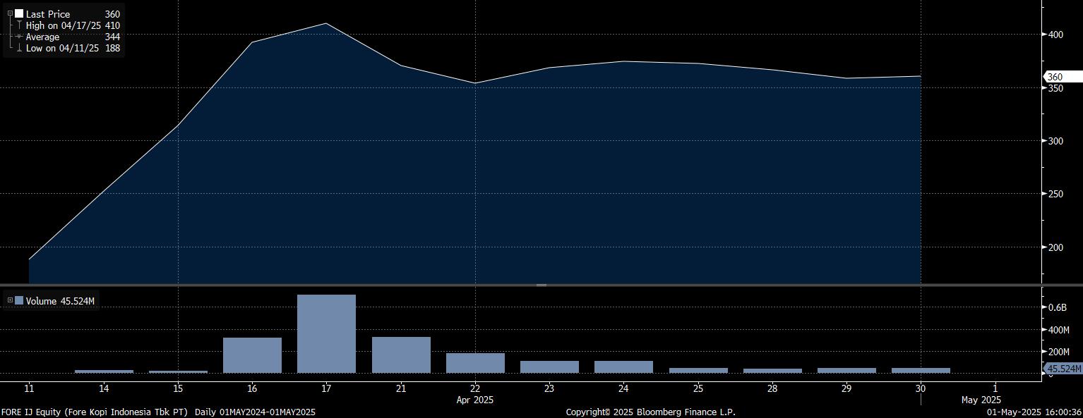 - PT Fore Kopi Indonesia Tbk PT (FORE), menguat 91,49%