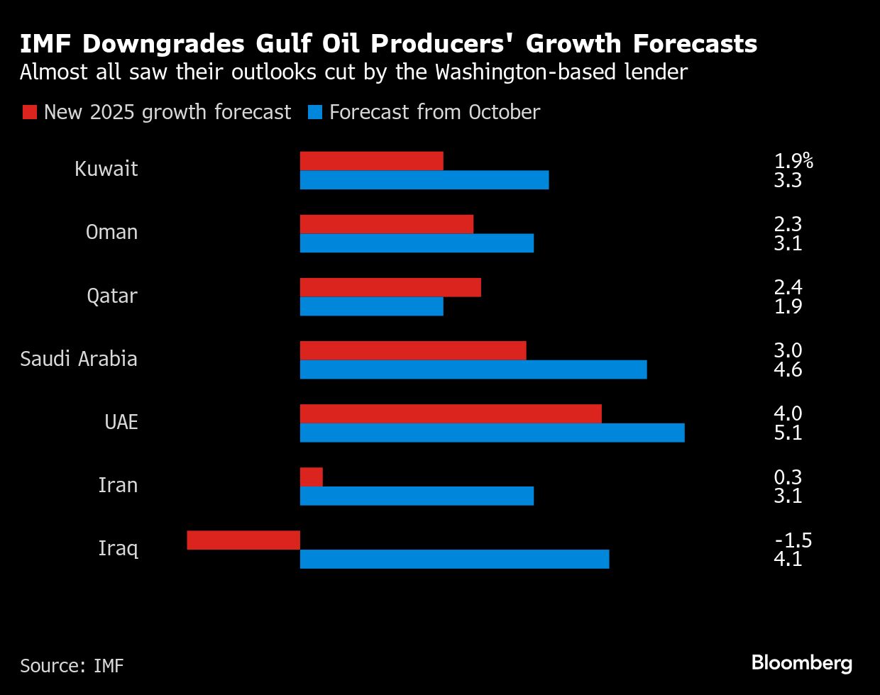 Bloomberg, Dana Moneter Internasional atau International Monetary Fund (IMF) menurunkan proyeksi pertumbuhannya untuk negara-negara pengekspor minyak di Timur Tengah dan Afrika Utara, termasuk Arab Saudi dan Irak, dengan alasan meningkatnya ketegangan perdagangan global dan harga energi yang lebih rendah.