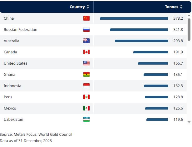 Sementara produksi emas Indonesia pada 2023 tercatat 132,5 ton. Indonesia menduduki peringkat ke-7 dunia.