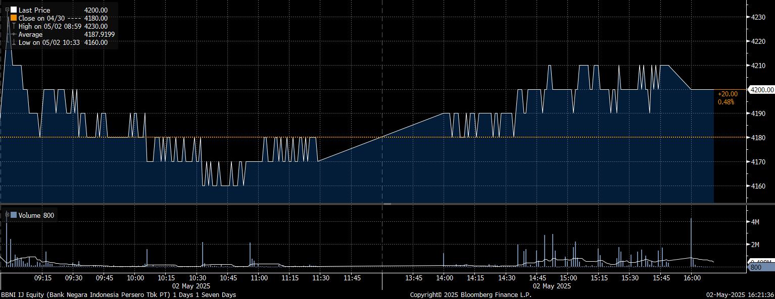 Bloomberg Technoz, Jakarta - Harga saham PT Bank Negara Indonesia Tbk (BBNI) berhasil menguat hari ini, searah dengan IHSG yang melesat di zona hijau dengan kenaikan 0,72% ke posisi 6.815. Ditutup perdagangan, saham BBNI mencatat kenaikan 0,48% ke level Rp4.200/saham pada Jumat (2/5/2025).