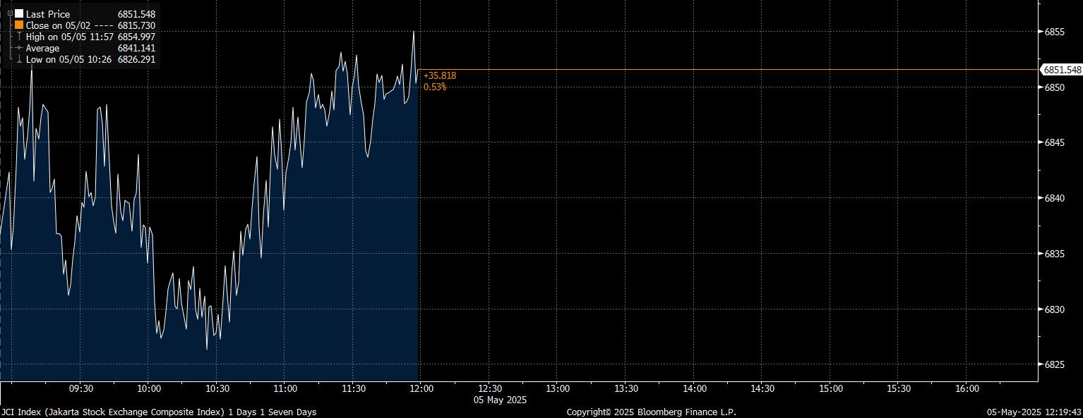 Sepanjang perdagangan pagi hingga siang IHSG terus melaju di zona hijau dengan rentang pergerakan pada terjadi pada level 6.824,39–6.857,71.