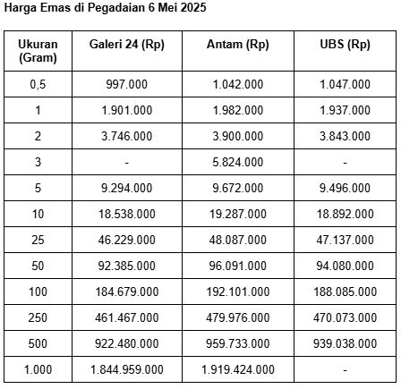 Sedangkan untuk ukuran 1 gram, harga emas Galeri 24 di Pegadaian adalah Rp 1.901.000. Tumbuh Rp 3.000 dalam sehari.
