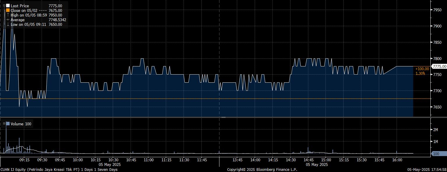 Sedang, investor asing net sell yang besar pada saham PT Petrindo Jaya Kreasi Tbk (CUAN) mencapai Rp76,95 miliar. Walaupun terjadi tekanan jual yang deras, saham CUAN tetap berhasil menguat 1,3% dan ditutup di posisi Rp7.775/saham.