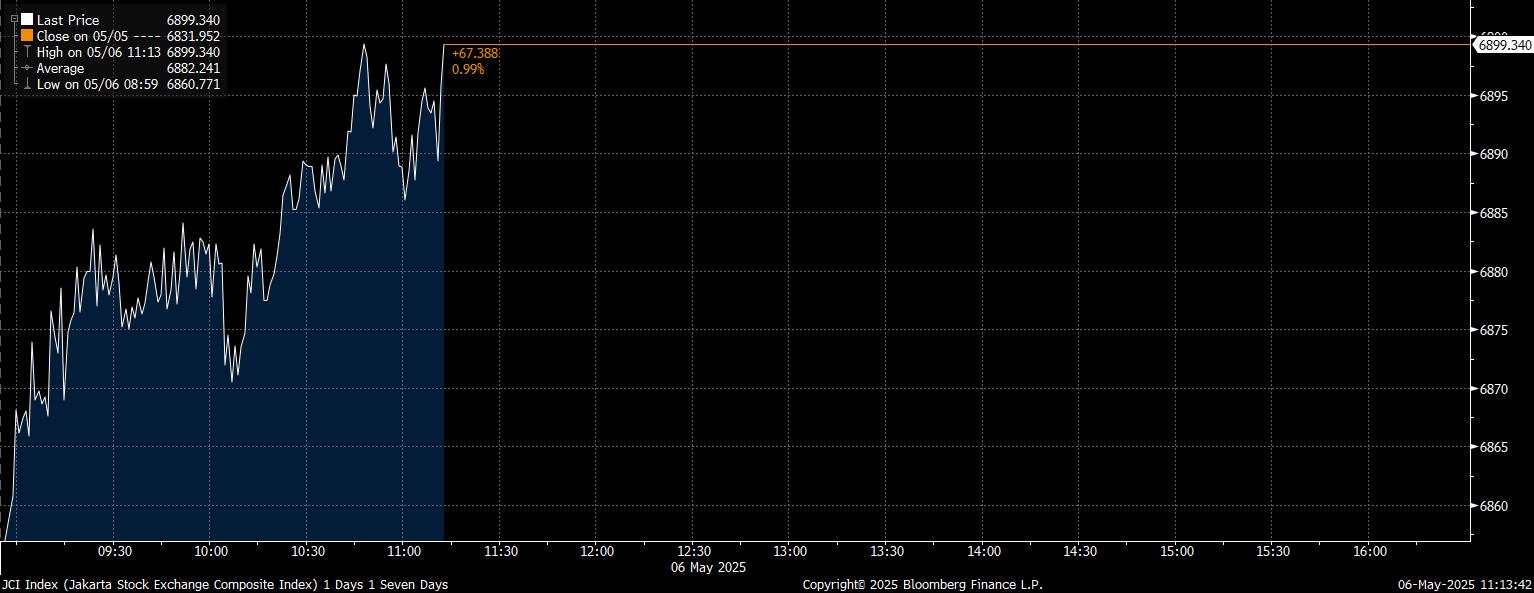 Bloomberg Technoz, Jakarta - Indeks Harga Saham Gabungan (IHSG) pada perdagangan Sesi I, Selasa (6/5/2025) mencetak penguatan yang amat optimis. Hingga pukul 11.20 WIB, IHSG melesat nyaris 1%, atau menguat 0,99% ke posisi 6.899.