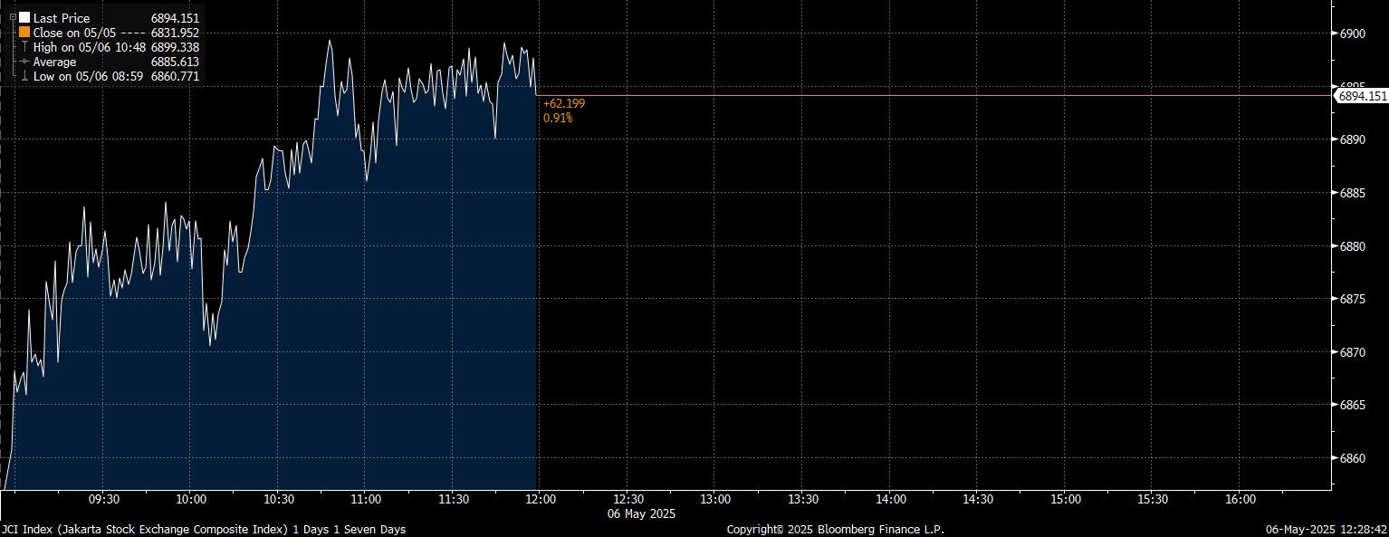 Hingga penutupan Sesi I siang hari ini, Selasa (6/5/2025), IHSG melesat 62,19 poin atau dengan keberhasilan menguat 0,91% ke level 6.894,15.