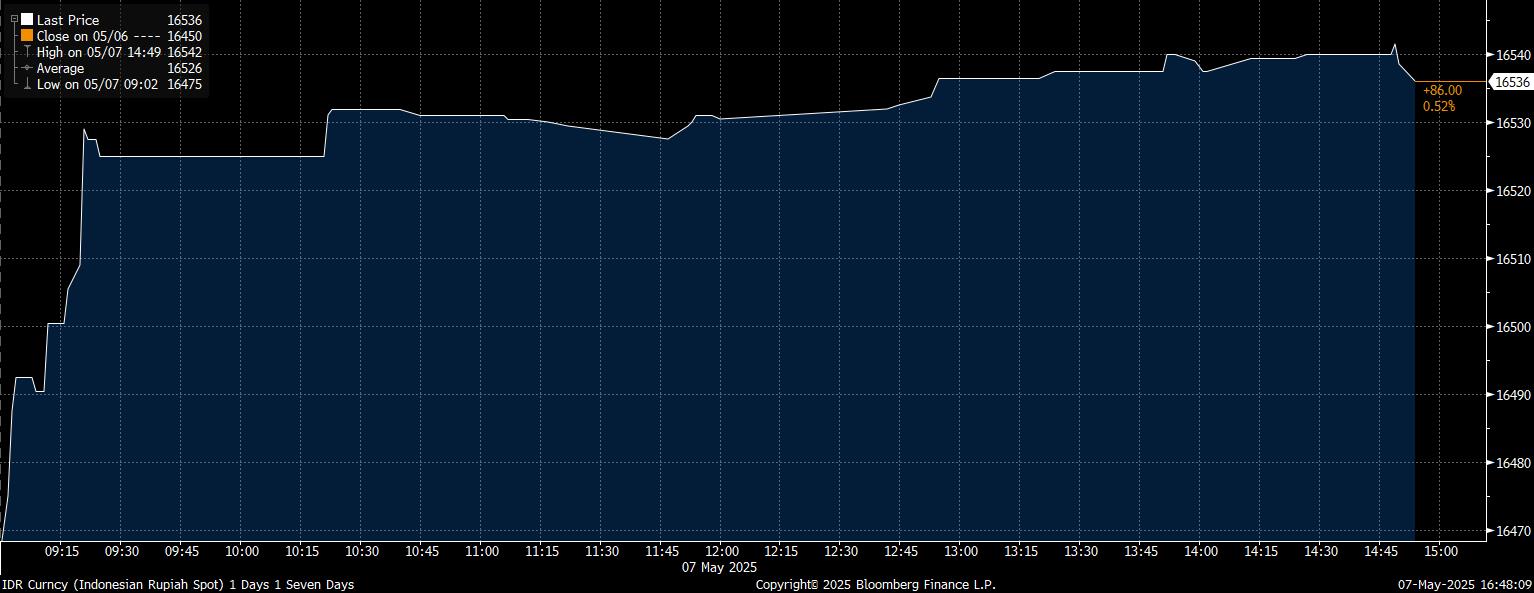 Dalam intraday trading hari ini rupiah sempat menyentuh level terlemahnya di Rp16.542/US$, tersengat sentimen kehati-hatian jelang pengumuman hasil FOMC The Fed, yang akan diumumkan pada Kamis dini hari nanti sehingga menyalakan mode Risk-Off lebih besar.