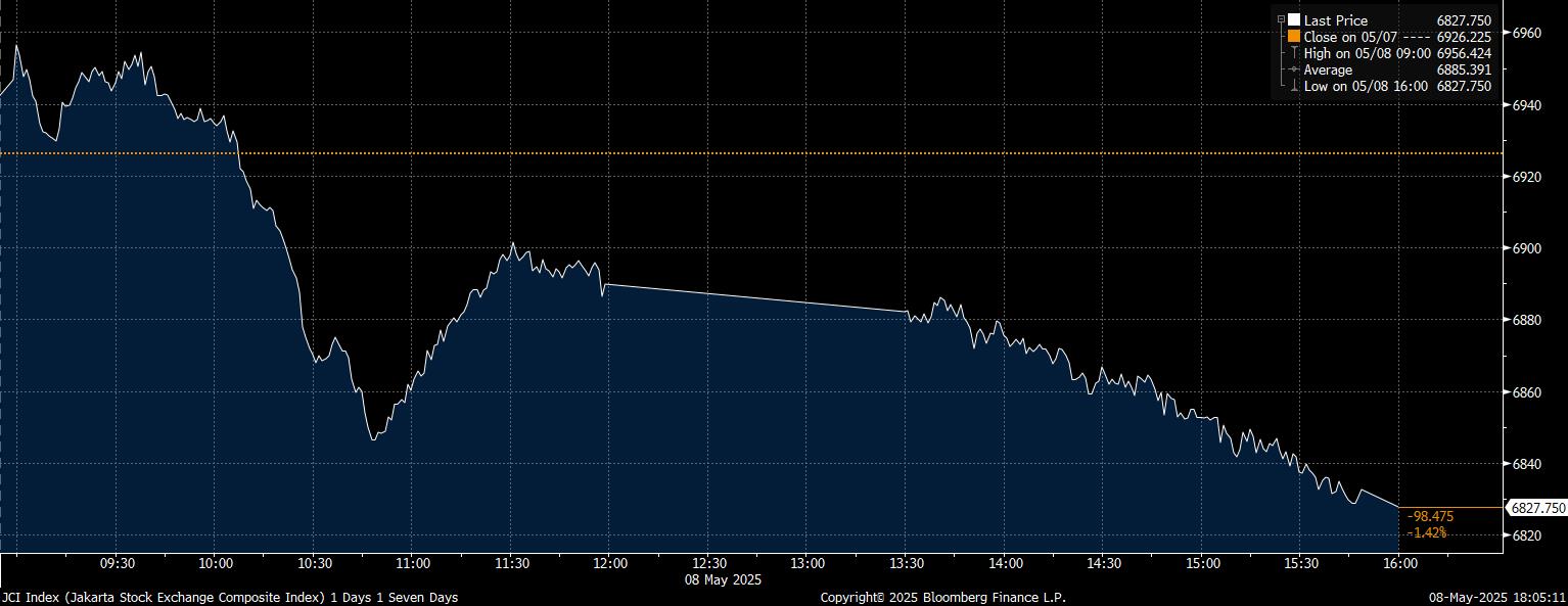 Pada Kamis (8/5/2025), IHSG ditutup di posisi 6.827,75. Melemah 1,42% dan 98,47 poin dibandingkan hari sebelumnya.