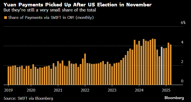 Di antara itu, upaya China terlihat menonjol menaikkan pamor mata uangnya. Yuan kini digunakan sekitar 4,1% dalam transaksi global menurut data yang dilansir oleh Swift, perusahaan global payment.